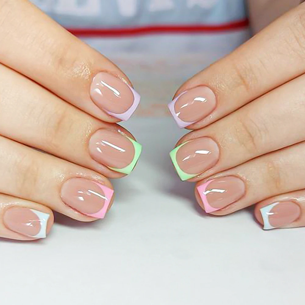 Faux ongles carrés courts français couleur bonbon, couleur bonbon, rose/vert/violet, couverture complète, Macarons à pression sur les ongles, manucure artificielle à faire soi-même, 240 pièces